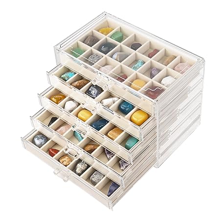 Rock Display Case, 5 Drawers 90 Grids Acrylic Rock Collection Box, Storage Cases for Small Rocks Gemstone Fossil Crystal Stone Jewellery Collectibles (Beige)