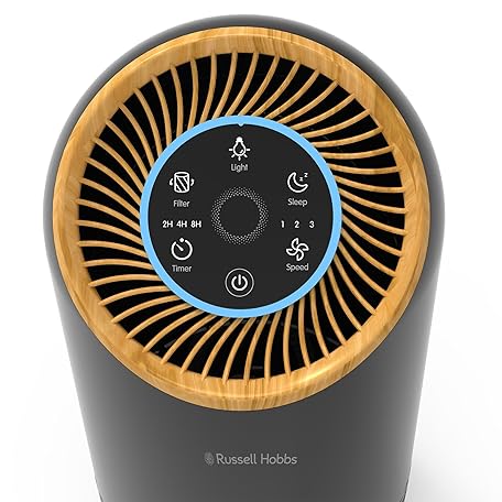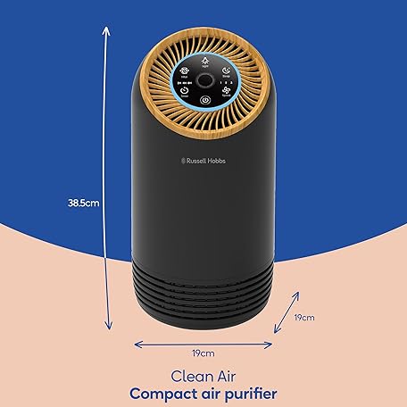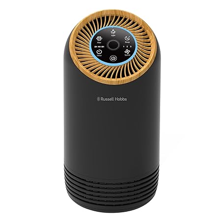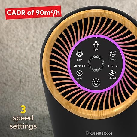 Thông tin sản phẩm Russell Hobbs Air Purifier for Bedroom Home 90m ³/h CADR, 99.95% Carbon Filter Captures Bacteria, Allergies Odour, Dust, LED Display, Clean Air Compact Black Scandi Wood Effect RHAP1031WDB