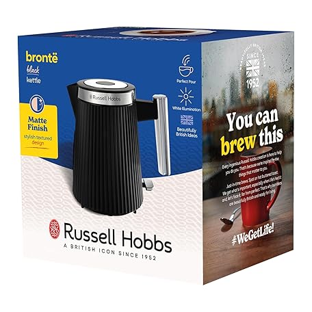 Thương hiệu Russell Hobbs là cái tên nổi tiếng được rất nhiều khách hàng trên thế giới chọn lựa. Với kiểu dáng đẹp mắt, sang trọng, sản phẩm Russell Hobbs Black Kettle [1.7L, 3000W] Brontë (Internal illumination, Perfect pour, 360° base with cord storage, Push to open lid, Distinctive Matte Finish design) 26750 là sự lựa chọn hoàn hảo nếu bạn đang tìm mua một món cho riêng mình.