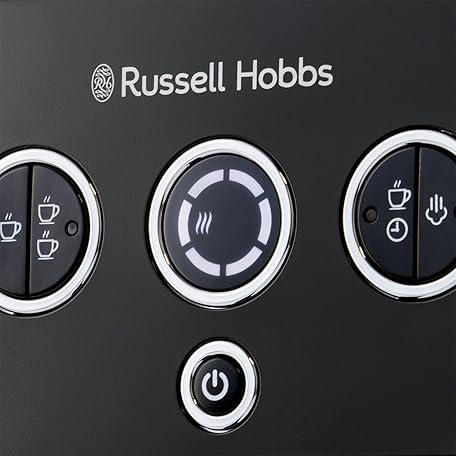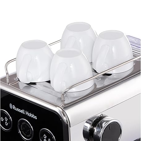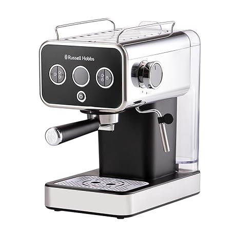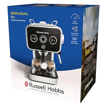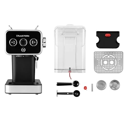 Thông tin sản phẩm Russell Hobbs Distinctions Espresso Coffee Machine, 15 Bar Pump Pressure + Milk Frother Steam Wand, Latte & Cappuccino, Detachable Water Tank, ESE pods, Cup warmer, Black, S/Steel, 1350W, 26450