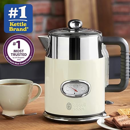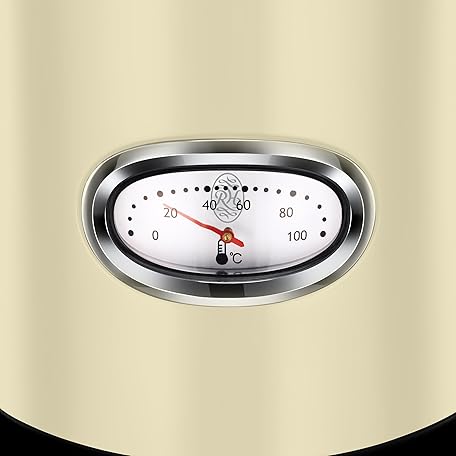 Thông tin sản phẩm Russell Hobbs Electric Kettle (1.7L, Rapid Boil function, Perfect Pour Spout, Stainless Steel accents, Retro design, Removable washable filter, Water temperature & level indicator, Cream) Retro 21672