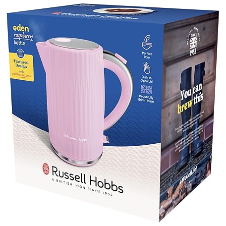 Thương hiệu Russell Hobbs là cái tên nổi tiếng được rất nhiều khách hàng trên thế giới chọn lựa. Với kiểu dáng đẹp mắt, sang trọng, sản phẩm Russell Hobbs Electric Kettle (Hot Water, Tea or Coffee, 1.7L, Push to open lid, Perfect pour spout, Removable washable filter, Illuminated switch, Chrome accents, Raspberry, 3000W) Eden 27362 là sự lựa chọn hoàn hảo nếu bạn đang tìm mua một món cho riêng mình.