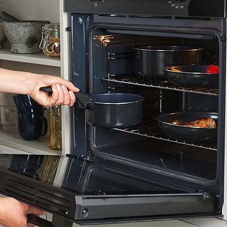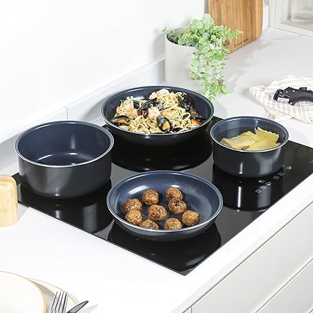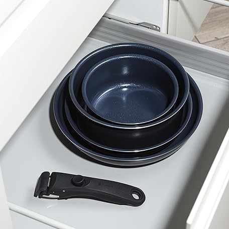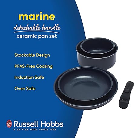 Thông tin sản phẩm Russell Hobbs RH03319EU7 Smart Clip Pot and Pan Set – 5 Piece Ceramic Non-Stick Frying Pans & Saucepans with Detachable Handle, Stackable Design, PFAS-Free, Induction Oven Safe, Marine, Navy Blue