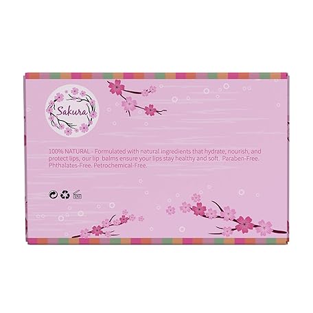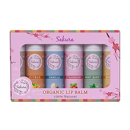 Thông tin sản phẩm Sakura Organic Lip Balm Set, 100% Natural, 6 Flavours - Strawberry, Citrus, Vanilla, Mint Burst, Beeswax and Coconut