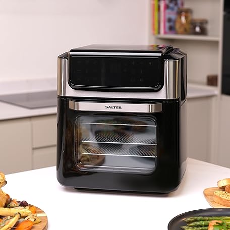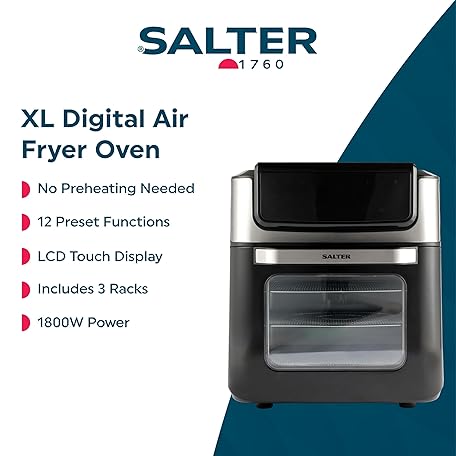 Thông tin sản phẩm Salter Digital Air Fryer – XL 12L Mini Oven, Healthy Air Fry/Roast/Rotisserie/Toast/Bake, 3 Racks Included, No Preheating Needed, 12 Preset Functions, LCD Touch Display, Adjustable Temp, 1800W