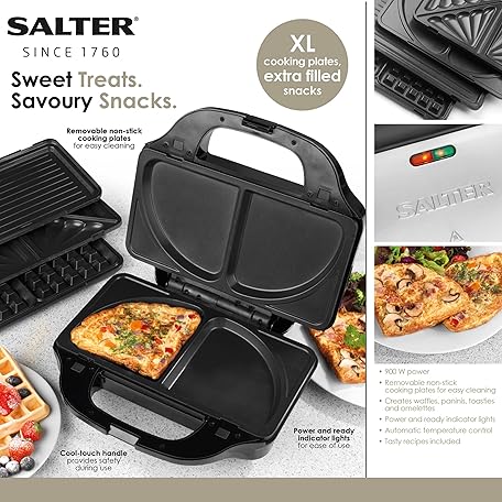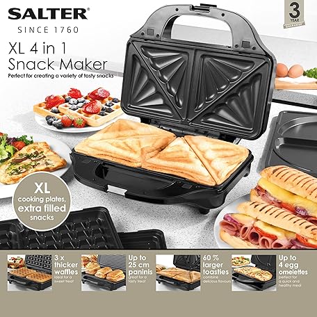 Thông tin sản phẩm Salter EK2143FOUR XL 4-in-1 Snack Maker, Interchangeable Non-Stick Cooking Plates, Electric Omelette Cooker, Waffle Iron & EK2143 Deep Fill 3-in-1 Snack Maker, Interchangeable Non-Stick Cooking