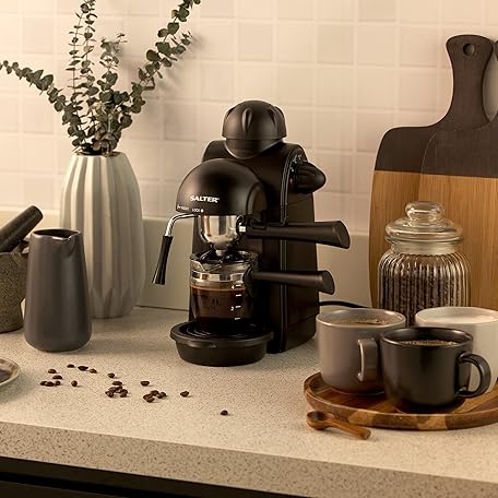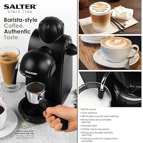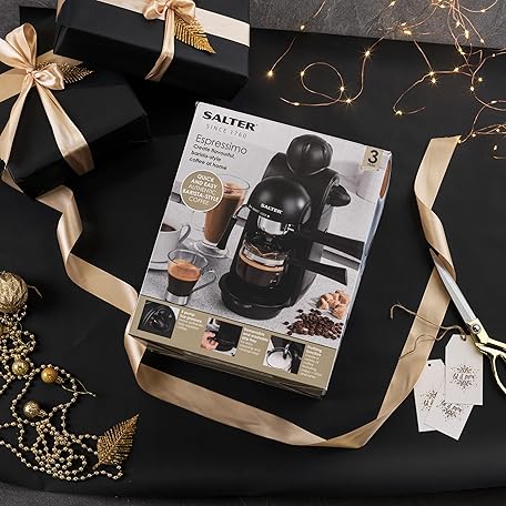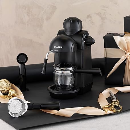 Thương hiệu Salter là cái tên nổi tiếng được rất nhiều khách hàng trên thế giới chọn lựa. Với kiểu dáng đẹp mắt, sang trọng, sản phẩm Salter EK3131 Espressimo, Home Espresso Machine with Milk Frother, Includes 240 ml Glass Carafe with Indicators, Barista Style Cappuccino and Lattes, 5 Bar Pressure, Stainless Steel Filter, 870W là sự lựa chọn hoàn hảo nếu bạn đang tìm mua một món cho riêng mình.