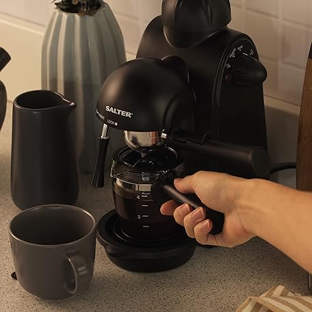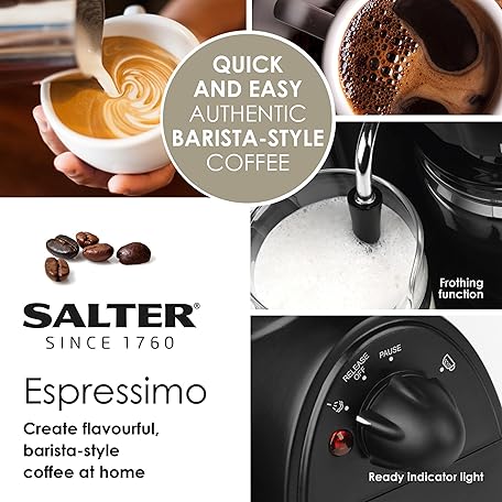 Thông tin sản phẩm Salter EK3131 Espressimo, Home Espresso Machine with Milk Frother, Includes 240 ml Glass Carafe with Indicators, Barista Style Cappuccino and Lattes, 5 Bar Pressure, Stainless Steel Filter, 870W