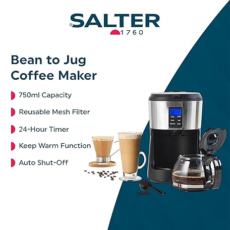 Thông tin sản phẩm Salter EK4368 Bean to Jug Coffee Machine – Electric Coffee Grinder, 750ml Filter Coffee Maker with Reusable Filter, Digital Display with Programmable Timer, Keep Warm and Auto-Shut Off Function, Black