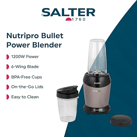 Thông tin sản phẩm Salter Nutripro Blender - Bullet Power Blender, Detachable BPA Free Blending Cups, Multipurpose 6-Wing Blade, Chop, Crush & Blend, Storage & Easy Drink Lid Included, 1L & 800ML Drinking Cups, 1200W