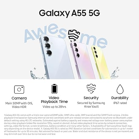 Samsung Galaxy A55 5G, Factory Unlocked Android Smartphone, 256GB, 8GB RAM, 2 day battery life, 50MP Camera, Awesome Iceblue, (UK Version) (Renewed)