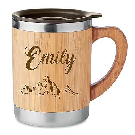 Schmalz Double-Walled Bamboo Insulated Mug with Engraving Sustainable Wooden Thermal Mug with Lid Drinking Opening Bamboo Stainless Steel 300 ml (Cup with Handle)