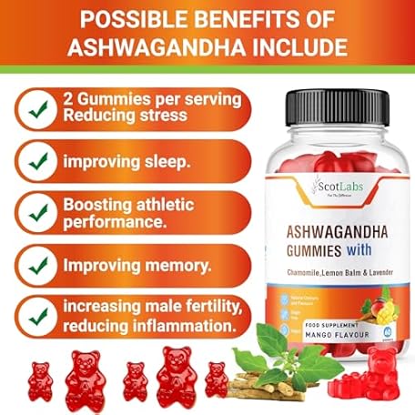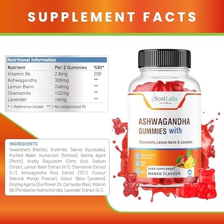 Thông tin sản phẩm ScotLabs Reduce Stress Formula - Ashwagandha, Levander, Chamomile & Lemon Balm Gummies with Added Vitamin B6, Sugar-Free Vegan, Natural Mango Flavour Candy