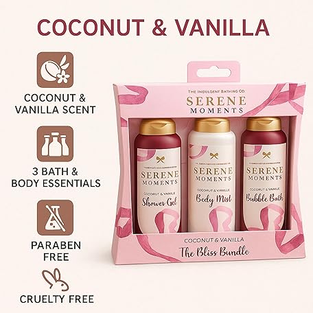 Sản phẩm Serene Moments Coconut & Vanilla Bath & Body Gift Hamper – Vegan & Cruelty-Free Spa Pampering Set (Body Wash 240ml, Body Mist 200ml & Bubble Bath 240ml) đang được bán với giá ưu đãi là $14.5624 tại nước Anh.