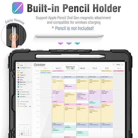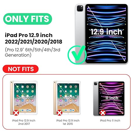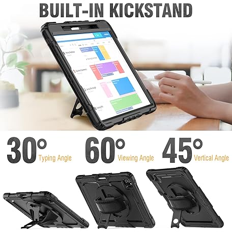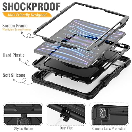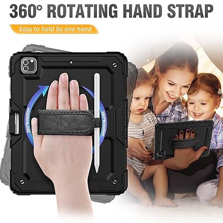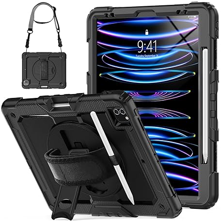 Thông tin sản phẩm SEYMCY Case for iPad Pro 12.9 Inch 2022/2021/2020/2018 (Pro 6th/5th/4th/3rd), Full-body Shockproof with Screen Protector, 360° Rotating Hand Strap & Stand, Carrying Strap, Pencil Holder, Black