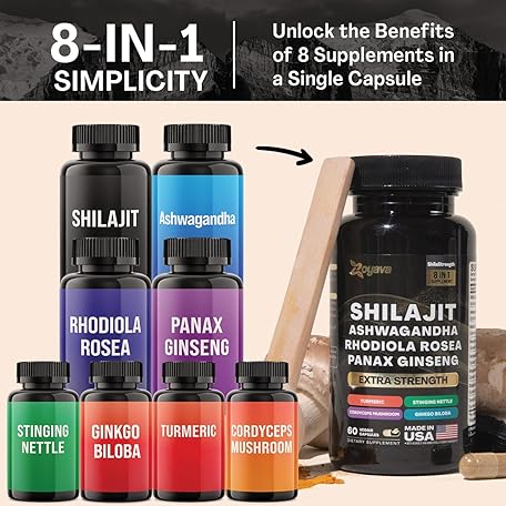Thông tin sản phẩm Shilajit 9000 Panax Ginseng 1500MG Ashwagandha 2000MG Rhodiola Rosea 1000MG, Turmeric 500MG, Gingko Biloba 500MG, Stinging Nettle 250MG, Cordyceps Mushroom (60 Caps)