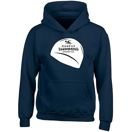 Shopagift Personalised Swimming Champion Kids Hoodie Swim Cap Any Name Hoody Hooded Top Boys Girls