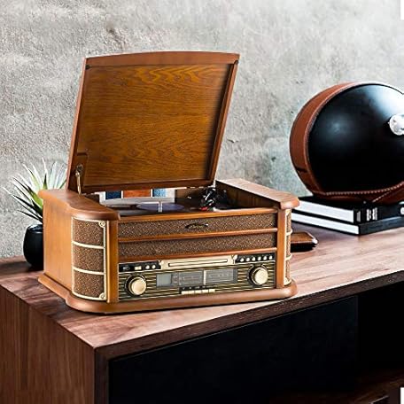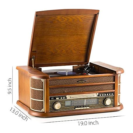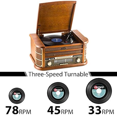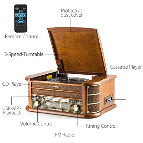 Thông tin sản phẩm Shuman Retro 8-in-1 Music Centre Record Player, Wireless Connection, Home Audio Centre with Remote Control, 3-Speed Vinyl Turntable, CD/Cassette Player, AM/FM Radio, USB Playback/Recording (MC-250BT)