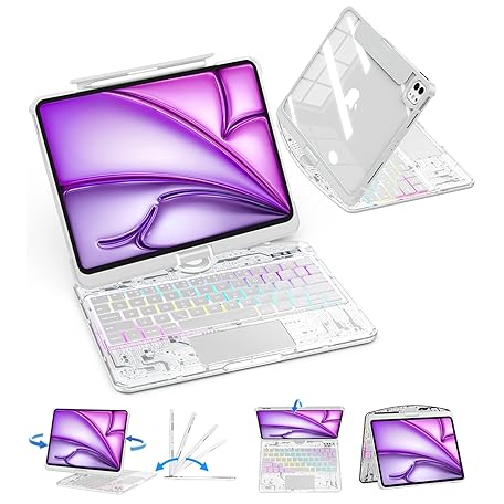 SIEBITU Clear Wireless Keyboard Case for iPad Air 13-inch (M3 2025/M2 2024) & iPad Pro 12.9-inch 6th 5th 4th 3rd Gen with Pencil Holder, Multi-Touch Trackpad & 7-Color Backlit, 360°Rotating, White