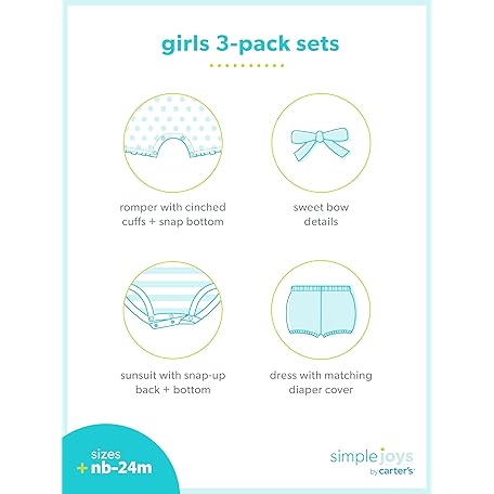 Thương hiệu Simple Joys by Carter's là cái tên nổi tiếng được rất nhiều khách hàng trên thế giới chọn lựa. Với kiểu dáng đẹp mắt, sang trọng, sản phẩm Simple Joys by Carter's Baby Girls 3-Pack Romper, Sunsuit and Dress Rompers là sự lựa chọn hoàn hảo nếu bạn đang tìm mua một món cho riêng mình.