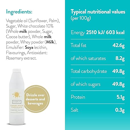 Sản phẩm Simply Luxury White Chocolate Topping Sauce, Ready to Use Dessert Sauce for Ice Cream, Waffles, Pancakes, Coffee & Milkshakes (1 kg) đang được bán với giá ưu đãi là $12.9274 tại nước Anh.