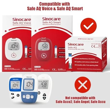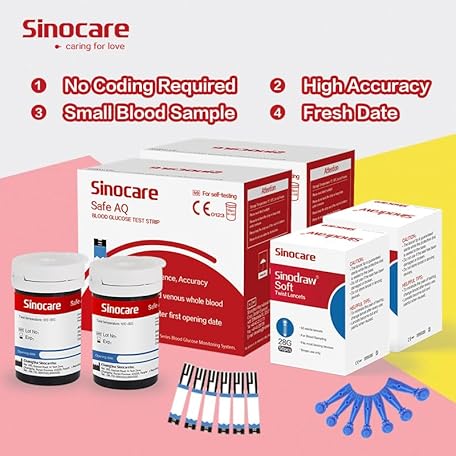 Thông tin sản phẩm sinocare (Safe AQ) Blood Glucose Test Strips x100 & Lancing Devices x 100, Diabetes Test Strips No Need Code, for UK Diabetics Home Self-Testing