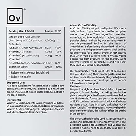 Thông tin sản phẩm Skin Hair Nails Supplement | Tablets Including Vitamin A, C, E, Selenium, Biotin & Grape Seed | Oxford Vitality | 240 Tablets