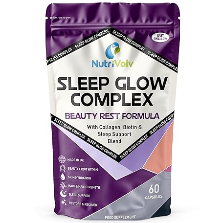 Sleep Glow Complex | 60 Capsules (30 Day Supply) | Collagen, Vitamin C, Hyaluronic Acid, Biotin, L-Theanine & Chamomile | Sleep Aid & Beauty Formula for Skin, Hair, Nails & Relaxation | by NutriVolv