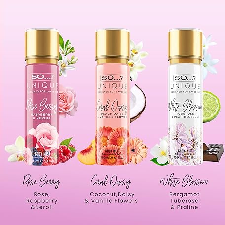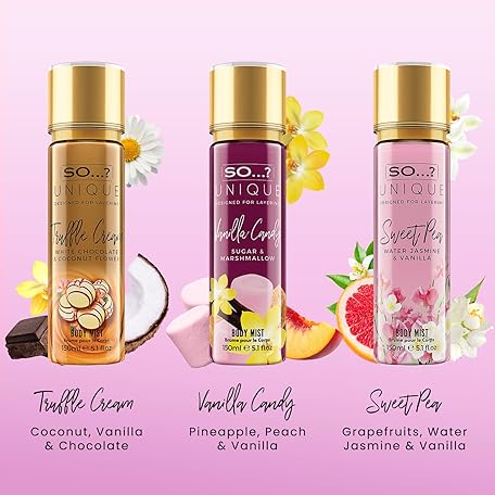 Thông tin sản phẩm So…? Unique Womens Body Spray Mixed Fragrance Bundle, Vanilla Candy, Truffle Cream, Sweet Pea, White Blossom, Coral Daisy, Rose Berry, 150ml (Pack of 6)