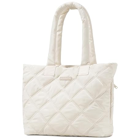 soewten Tote Bag for Women, Puffer Bag with 15.6 Inch Compartment, Small Tote HandBags with Multi Pocket for Travel, Work, Gym, Great Gifts for Mom, Beige