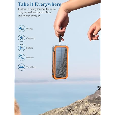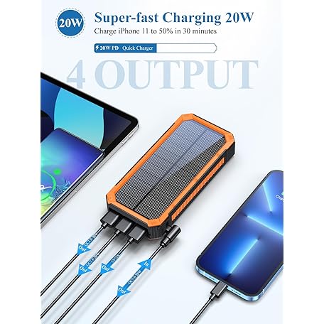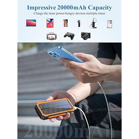 Thông tin sản phẩm Solar Power Bank 20.000 mAh, PD20W Waterproof Solar Charger USB C External Battery Solar Chargers with Outputs, Power Bank for Smartphones, Tablets and More