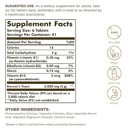 Thông tin sản phẩm Solgar Brewer's Yeast with Vitamin B12 Tablets - Rich source of protein, vitamins, minerals and acids - Healthy nervous system - Vegan,250 Count (Pack of 1)