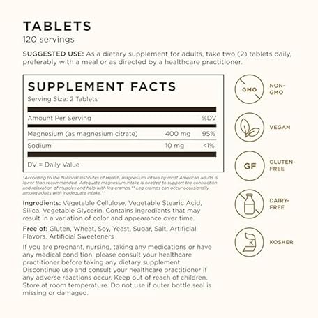 Thông tin sản phẩm Solgar Magnesium Citrate Tablets, Supports the Nervous System, Energy Release, Reduces Tiredness and Fatigue, Vegan, Brown, 120 Count