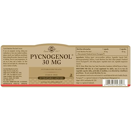 Sản phẩm Solgar Pycnogenol 30mg Vegetable Capsules - Pack of 60 - Vitamin C - Derived From Pine Bark - Vegan, Kosher and Gluten-Free đang được bán với giá ưu đãi là $48.6903 tại nước Anh.