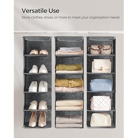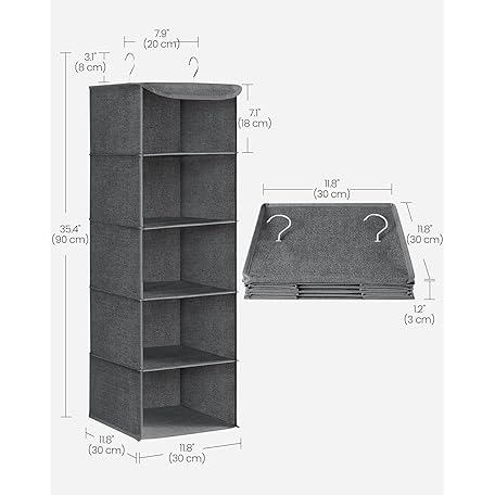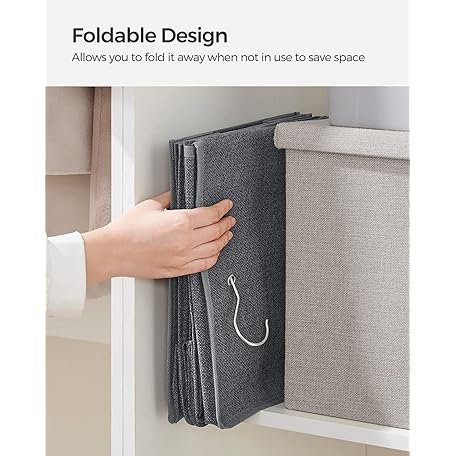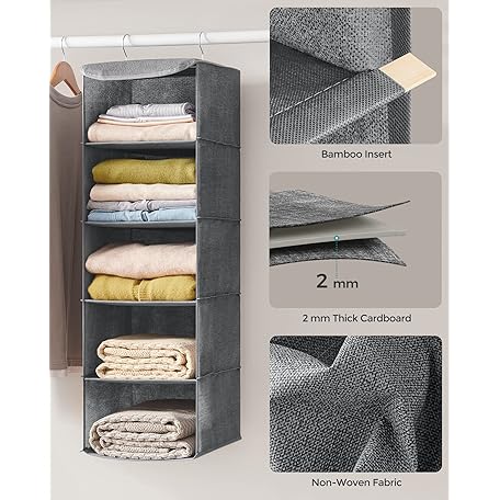 Thông tin sản phẩm SONGMICS Hanging Wardrobe Storage Organiser, Hanging Storage Shelves, Foldable Wardrobe Clothes Organiser, Space-Saving, Metal Hooks, Bamboo Inserts, Linen Pattern,Grey RYCH06G