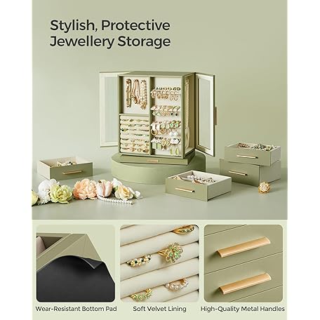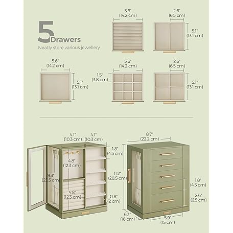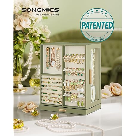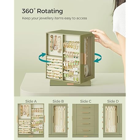 Thông tin sản phẩm SONGMICS Jewellery Box 360° Rotating, Jewellery Organiser with 5 Drawers, Jewellery Display Case, Glass Window, Spacious, Vertical Jewellery Storage, Open Design, Great Gift, Laurel Green JBC170C02