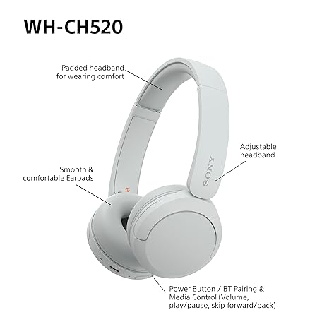 Thông tin sản phẩm Sony WH-CH520 Wireless Bluetooth On-Ear Headphones, Lightweight Design, Up to 50hr Battery Life, Quick Charge, EQ, Clear Call Quality, iOS & Android - White
