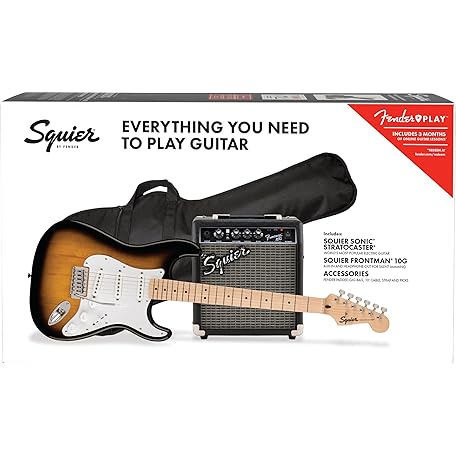 Thông tin sản phẩm Squier by Fender Sonic Stratocaster Electric Guitar Pack, Maple Fingerboard in 2 Colour Sunburst, Gig Bag, Squier Frontman 10W Guitar Amp, Picks, Strap, Cable, Comes with Free Virtual Lessons