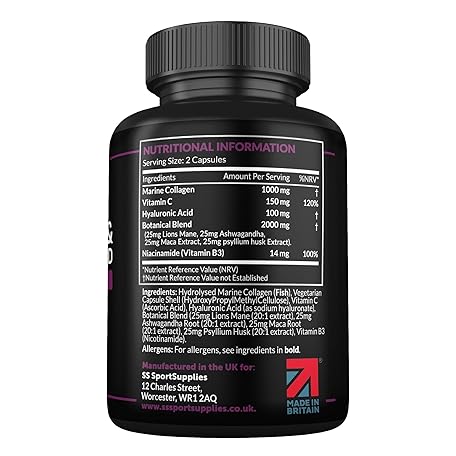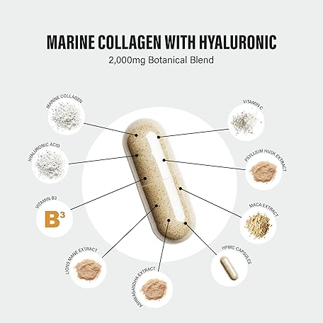 Thông tin sản phẩm SS Sport Supplies Collagen Supplements for Women-100% Marine Collagen Boosted with Hyaluronic Acid, Vitamin C, Niacinamide & 2,000mg Botanical Blend including Lions Mane, Ashwagandha, Maca and Psyllium Husk-60 Capsules