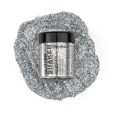 Stargazer Glitter Shaker, Silver. Cosmetic glitter powder for use on the eyes, lips, face, body, hair and nails.