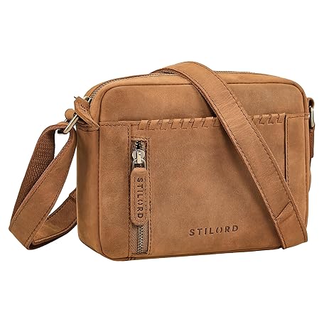 • STILORD 'Marisa' Boho Small Crossbody Bag for Women Genuine Leather Cross Body Bag Vintage Style Handbag with Compartments - Ideal Anti Theft Shoulder Bags with Zipper, Colour:tan-dark-brown