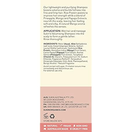 Thông tin sản phẩm Sukin Volumising Shampoo 500ml- boosts volume & builds into fine & limp hair, nourishes the scalp, hair feels soft & silky- with Rice Protein, Pineapple, Mango, Papaya & Vitamin E; vegan friendly.