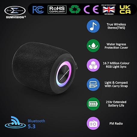Sản phẩm Sumvision Monic Wave Portable Bluetooth Speaker True Wireless Stereo Speakers 3D Sound Enhance RGB 21Hr 1800mAh Long Life Battery Bluetooth 5.3 USB C Fast Charge Drop Protect UK Design UK Tech Support đang được bán với giá ưu đãi là $21.3422 tại nước Anh.