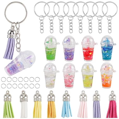 SUNNYCLUE 45Pcs DIY 8 Sets Milk Tea Cup Keychain Bubble Tea Charms With Faux Suede Tassels Mini Sweet Cute Milktea Cups Colorful Drink Charms for Handbags Purses Bags Backpacks Women Adults Supplies