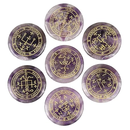 SUNYIK Round Engraved Archangels Gabriel Sigil Talisman Stone Set of 7, Pocket Worry Palm Stones for Healing Reiki Decoration Wicca Amulet, Amethyst