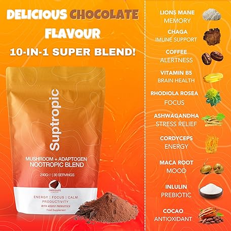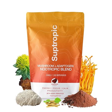 Sản phẩm SUPTROPIC | 10-in-1 Mushroom Powder Drink, Organic, Chocolate Mushroom Coffee for Energy & Focus - Incl. Lions Mane, Chaga, Cordyceps, Maca Root, Inulin, Rhodiola, Cacao & KSM 66 Ashwagandha | Vegan đang được bán với giá ưu đãi là $33.6701 tại nước Anh.
