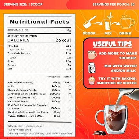 Thông tin sản phẩm SUPTROPIC | 10-in-1 Mushroom Powder Drink, Organic, Chocolate Mushroom Coffee for Energy & Focus - Incl. Lions Mane, Chaga, Cordyceps, Maca Root, Inulin, Rhodiola, Cacao & KSM 66 Ashwagandha | Vegan