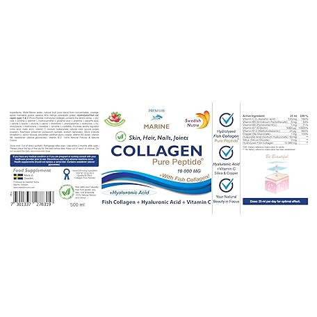 Thông tin sản phẩm Swedish Nutra Liquid Marine Collagen 10000mg - Pack of 500ml I Hydrolyzed Collagen Peptides (Type I & III) I Minimize Fine Lines, Wrinkles I Hyaluronic Acid, Biotin, Vitamin C - 20 Day Supply