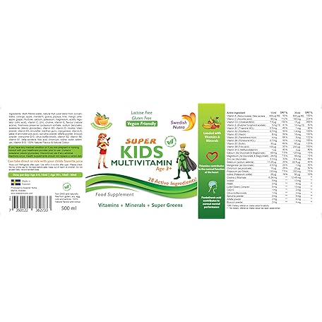 Thông tin sản phẩm Swedish Nutra Super Kids Multivitamin Liquid Food Supplement - 500 ml, 33 Day Supply | Vitamins, Minerals & Super Greens to Boost Growth, Energy & Immunity | Natural Orange Flavour | Age 3+