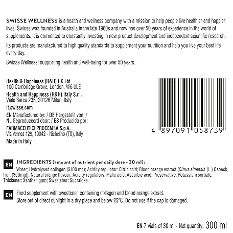 Thông tin sản phẩm SWISSE Collagen Liquid - Hydrolysed Collagen Supplements for Women & Men with Blood Orange Extract for Elastic & Radiant Skin, 7 x 30 ml Bottles - Beauty Supplement to Reduce Wrinkles - Made in Italy